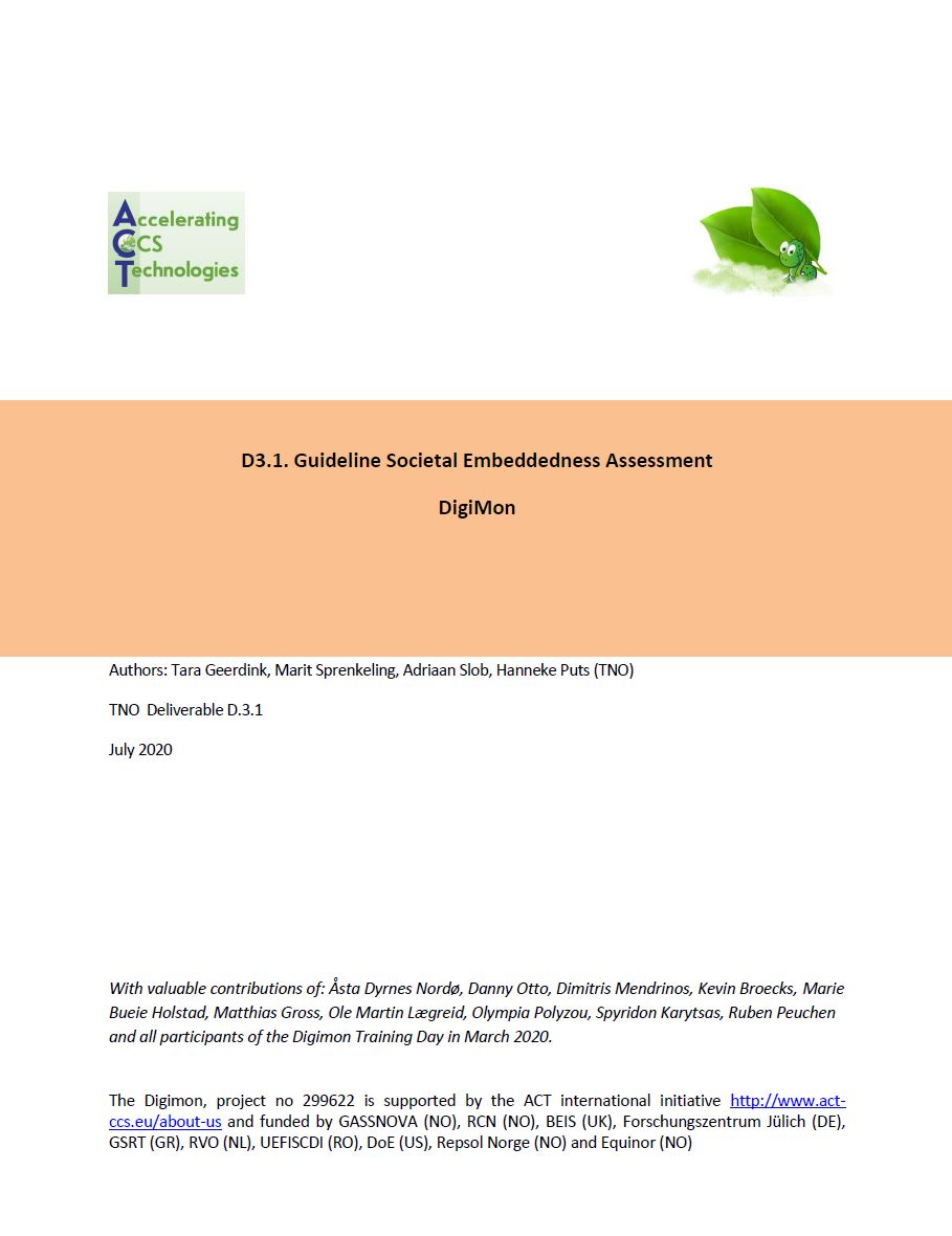 The report presents the guideline for applying the SEL methodology and conducting a SEL assessment of a technological innovation. The Societal Embeddedness Level (SEL) is a novel methodology which provides insight in the societal requirements for a technological innovation to be deployed. The SEL methodology builds upon the Technology Readiness Level (TRL), i.e. the SEL is related to the TRL. This guideline presents an introduction to the SEL methodology and the main elements of the methodology, the SEL assessment guideline itself and how the assessment outcome can be used to enhance the SEL. It provides a step-by-step approach for (1) assessing the current SEL of a technological innovation, (2) gaining insight in the societal challenges still to overcome towards deployment of the technological innovation, and 3) developing the building blocks for a strategy to societal embedded a technological innovation based on the SEL assessment outcome. This guideline will be used in the ACT Digimon project for a national SEL assessment of Carbon Capture Storage (CCS) and a local SEL assessment of the Digimon monitoring system.